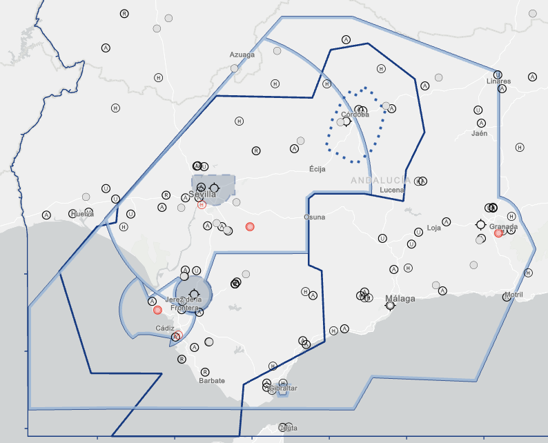 Puesto que el TMA de Sevilla engloba mucho más volumen del que Sevilla Aproximación es responsable. Se ha marcado en azul oscuro el contorno del área de responsabilidad de Sevilla Aproximación para que sea más fácil identificar las áreas relevantes.