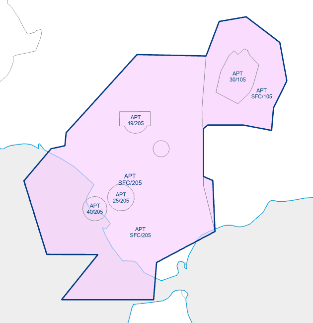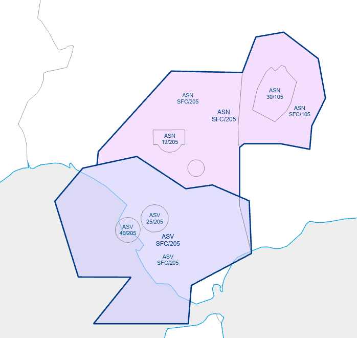 - TMA Sevilla - Área 2: Límites horizontales delimitados por el contorno azul que Rota (Cádiz). Desde 1000ft AGL a 4000ft AMSL es Clase D. La unidad responsable de este área del TMA es LERT TWR (MILITAR) por delegación del ACC de Sevilla.