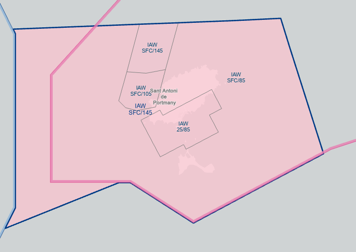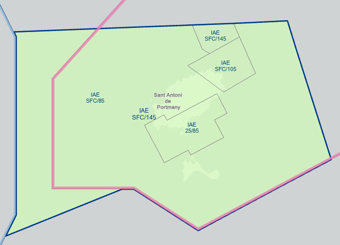 • CTR Ibiza: El polígono sombreado azul sobre Ibiza. Cubre desde SFC hasta 2500ft. Clase D.