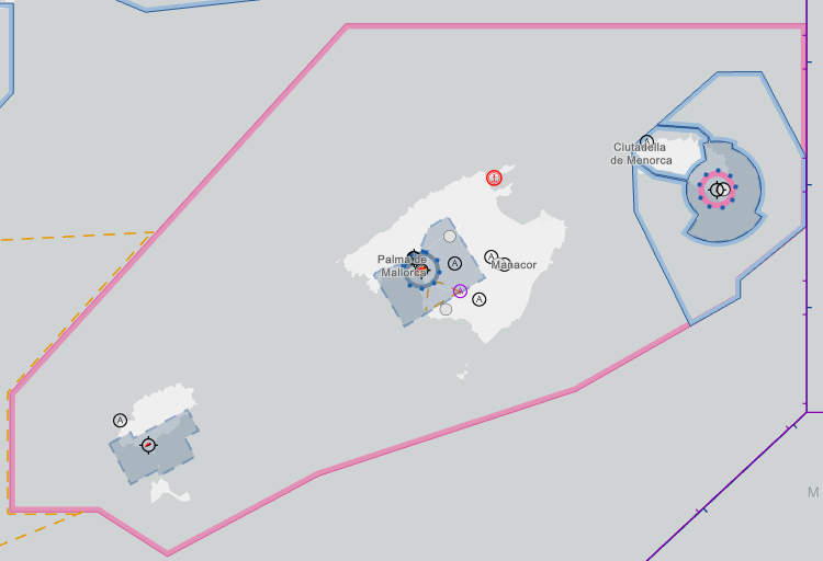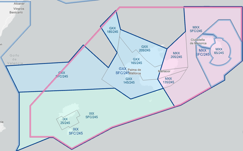 • TMA Palma: El contorno rosado que abarca el archipiélago balear. Cubre desde SFC a FL245. Se clasifica cómo Clase A desde el límite superior de los sectores VFR o ATZ/CTR hasta FL195, Clase C desde FL195 a FL245, Clase E en los pasillos VFR, y Clase G en los sectores VFR.
