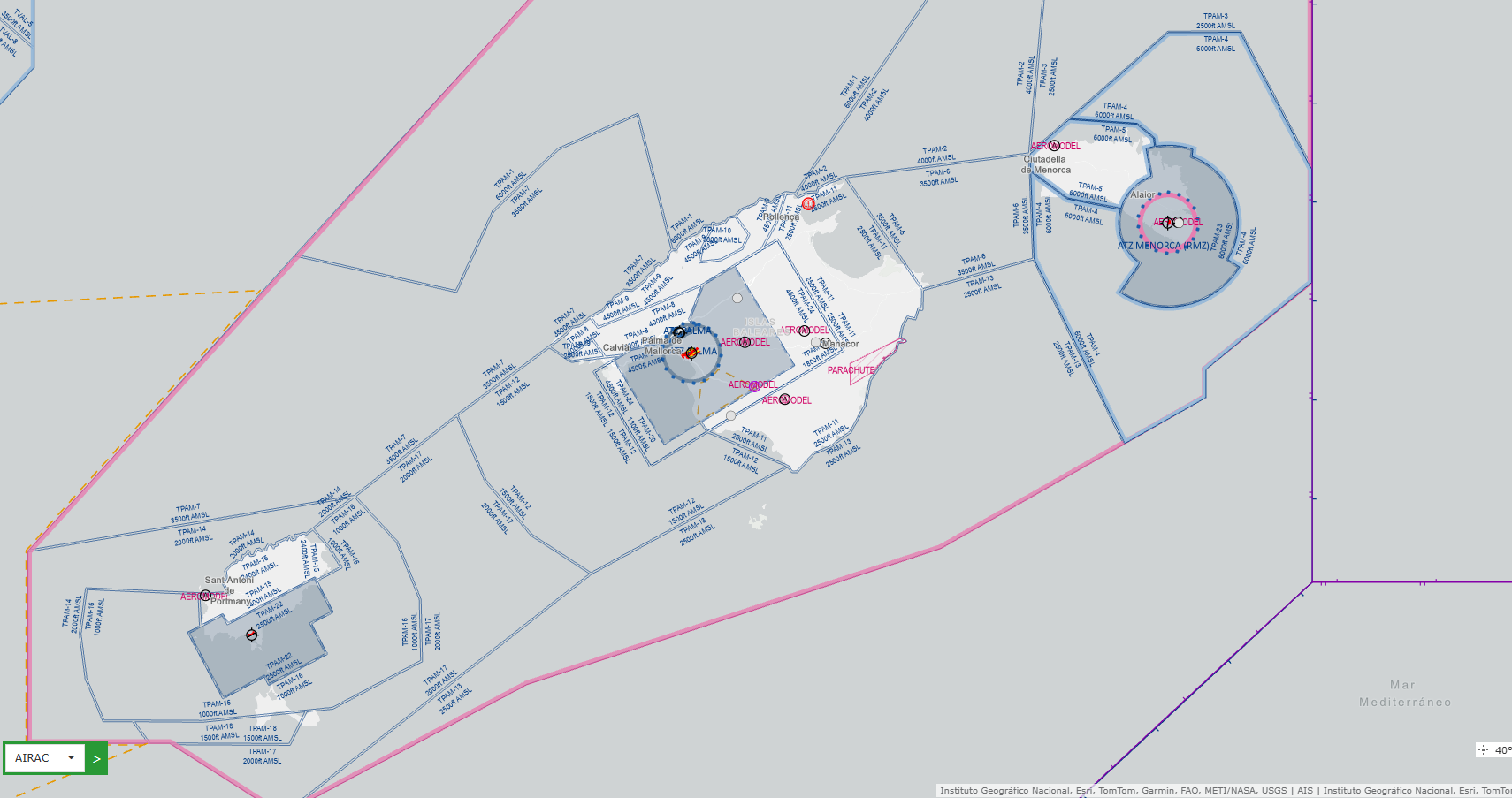 • ATZ Menorca: Circunferencia rosada sobre Menorca. Cubre desde SFC hasta 3000ft. Clase D desde SFC a 1000ft AGL. Clase A desde 1000ft AGL hasta 3000ft.
