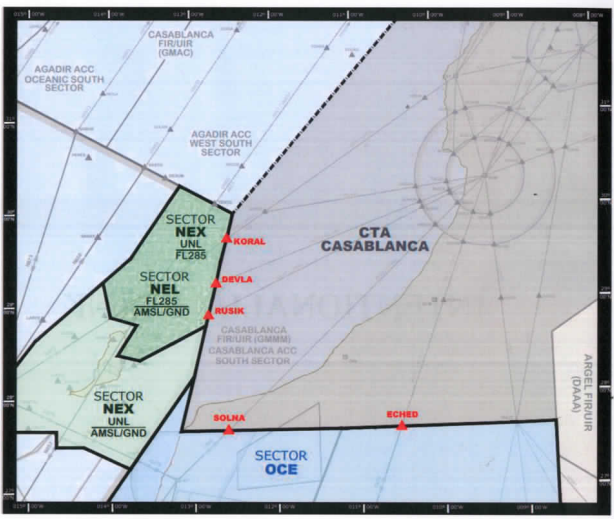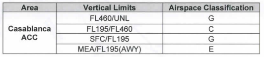 • La clasificación del espacio aéreo OACI correspondiente al área de responsabilidad del ACC de Casablanca, a lo largo del límite común entre el área de responsabilidad del ACC de Casablanca y el ACC de Canarias, se describe en el Anexo B de este documento.