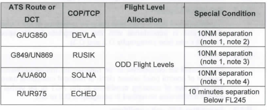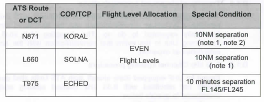 Las rutas ATS disponibles, DCTs y COPs a utilizar, así como la asignación de niveles de vuelo a aplicar, salvo que se indique lo contrario en el párrafo , se describen en las siguientes tablas.
