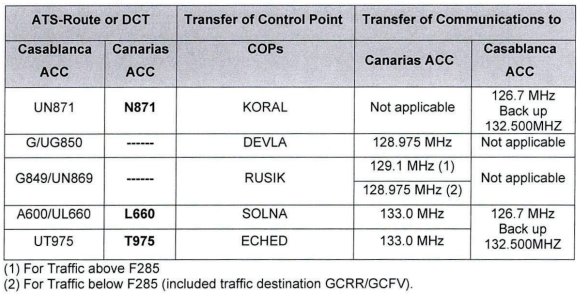 • El ACC de Casablanca transmitirá de el ACC de Canarias las autorizaciones de salida a las aeronaves que despeguen de los aeropuertos mencionados y se dirijan hacia el norte, el sur o de manera aleatoria.
