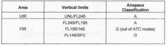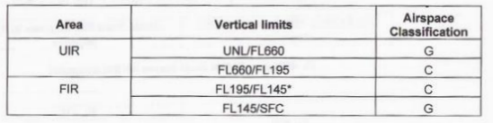 * Un área específica está definida en el AIP ESPAÑA ENR 2.1.3, donde la clasificación del espacio aéreo desde el nivel de vuelo FL145 hasta FL195 es “G” (zona del Sahara), en lugar de “C”.