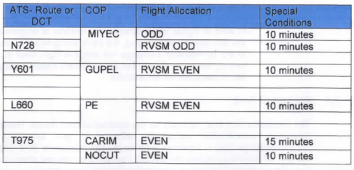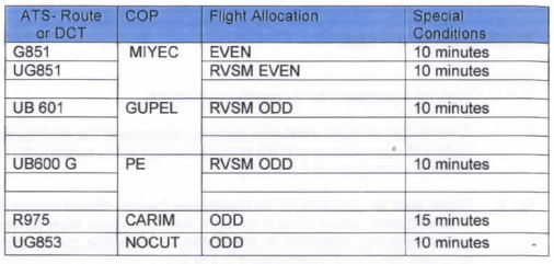 Las rutas ATS disponibles, DCTs y COPs a utilizar, así como la asignación de niveles de vuelo a aplicar, salvo que se indique lo contrario en el párrafo , se describen en las siguientes tablas.
