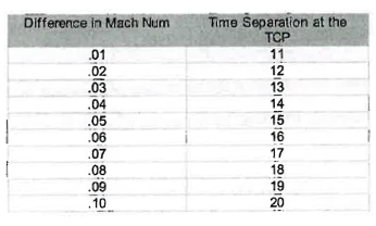 - Para más de 10 mínutos de acuerdo a la siguiente tabla cuando la aeronave precedente está manteniendo un número Mach inferior al que sigue. Cada FIR enviará al tráfico al FIR vecino con la Técnica del Número Mach descrito en la tabla de abajo: