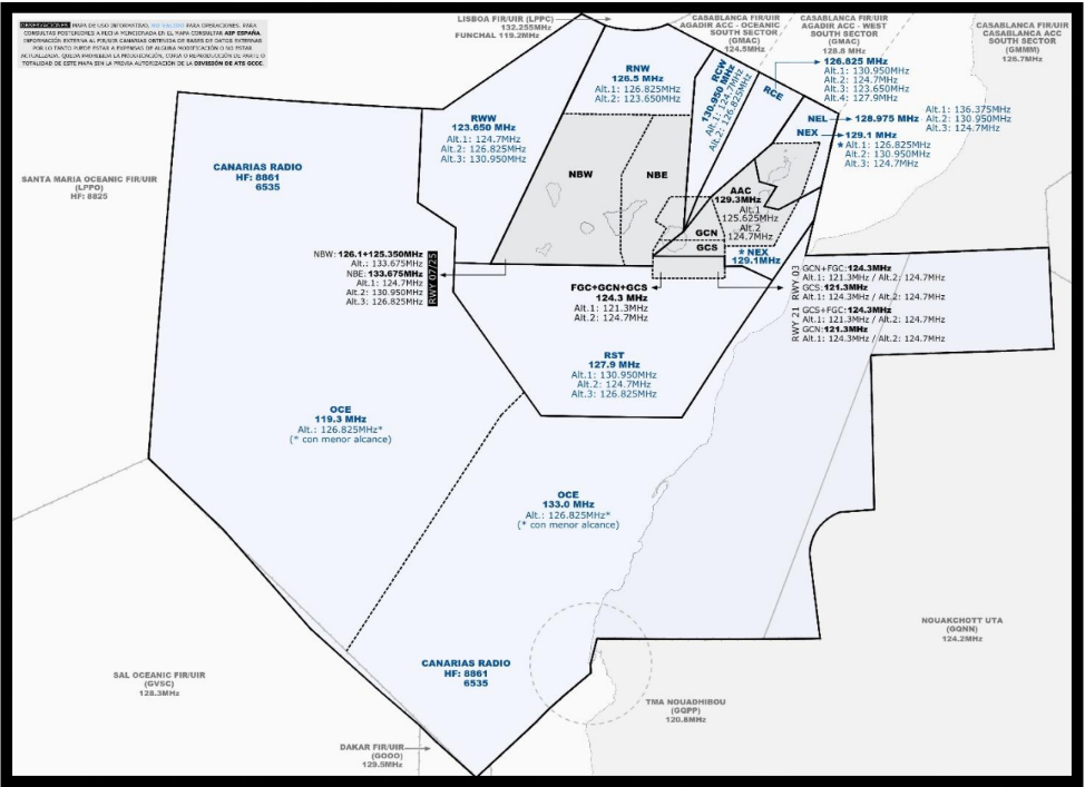 - Mapa del Espacio Aéreo del FIR Canarias, con descripción de sectores, frecuencias y colaterales