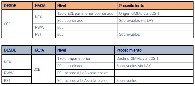- NEX asignará nivel final y lo introducirá en el ECL. Para arribadas a GMML, el nivel será impar. Para sobrevuelos por LAY el nivel final deberá ser coordinado con OCE, dependiente de la ruta. Después de LAY o del tráfico que esté gestionando el sector OCE.