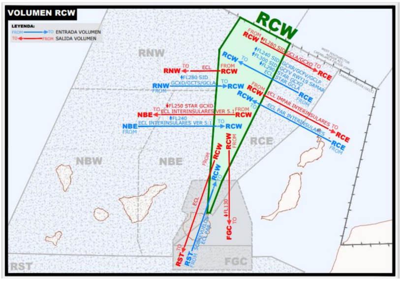 GCCC_RCW_CTR | RCW | Canarias Control | 130.950 | Sector central oeste de control del ACC de Canarias. Alimentador para llegadas a GCLP y GCXO por SAMAR. |