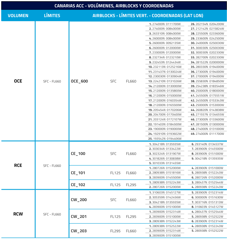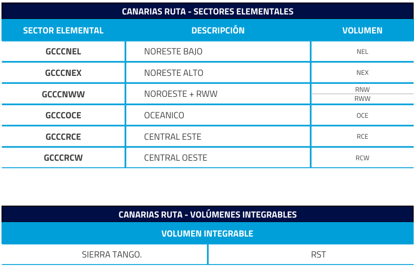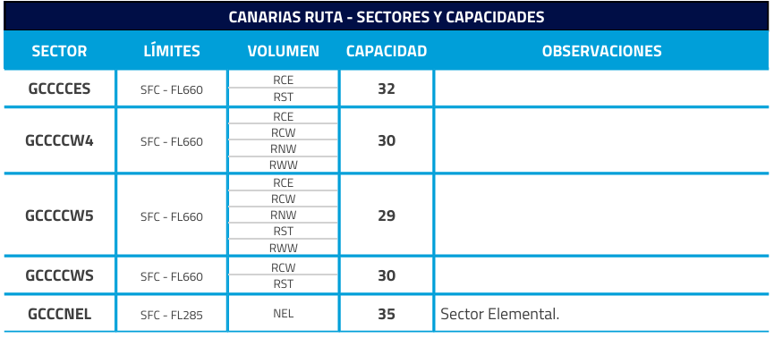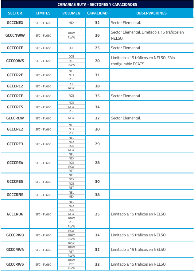 GCCC_R6_CTR | Canarias Control | 123.650 | Sector principal de control del ACC de Canarias. Cubre toda la parte doméstica del FIR. |