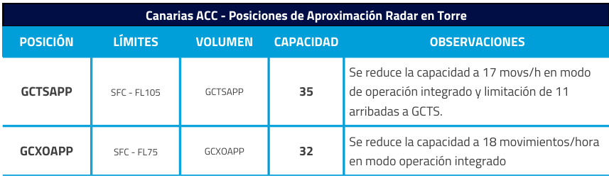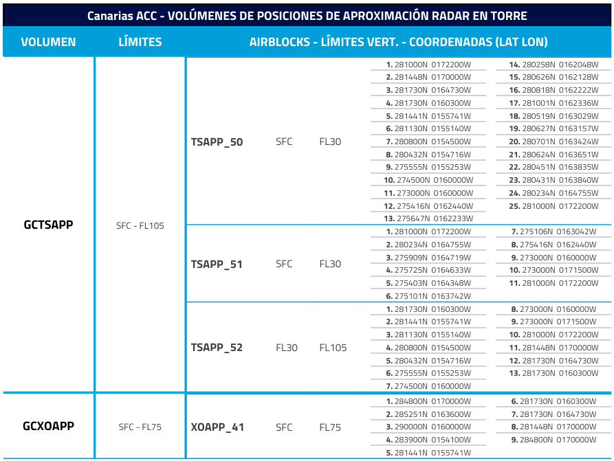La clasificación del espacio aéreo está recogida en el AIP-España ENR 1.4. Los TMA bajo su jurisdicción se encuentran en el AIP-España ENR 2.1. Los CTR y ATZ de aeródromos bajo la jurisdicción de la dependencia o a los que presta servicio se encuentran dentro del AD-2 (GCFV, GCGM, GCHI, GCLA, GCLP, GCRR, GCTS, GCXO, GSAI, EL AAIUN, GSVO VILLACISNEROS- La información de estos dos campos del Sahara no está actualizada en el AIP).