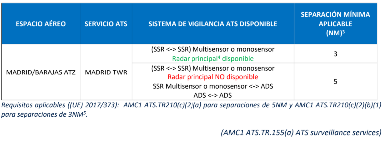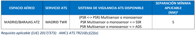 Siempre poseeremos como disponible el sistema de vigilancia ATS (SSR <-> SSR) Multisensor SSR Multisensor <-> ADS ADS <-> ADS; por lo que la separación mínima horizontal en Madrid-Barajas será de 3 NM, sujeto a la configuración en uso y carta de acuerdo.