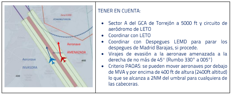 - Si fuera necesaria una maniobra de evasión del tráfico amenazado en 32L, la acción del CTA de AWN se concreta en el modo general de actuación, basándonos en la posición relativa de los tráficos amenazado e invasor.