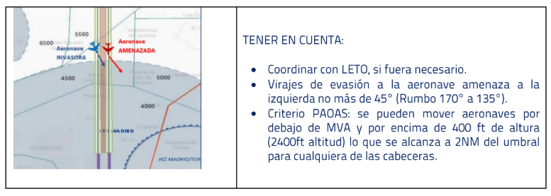 Las maniobras para devolver a una aeronave desviada, y potencialmente INVASORA de la NTZ, a su curso o derrota de aproximación final, o las maniobras de evasión de una aeronave AMENAZADA por la anterior, están condicionadas por el espacio físico de las operaciones en Madrid TMA.