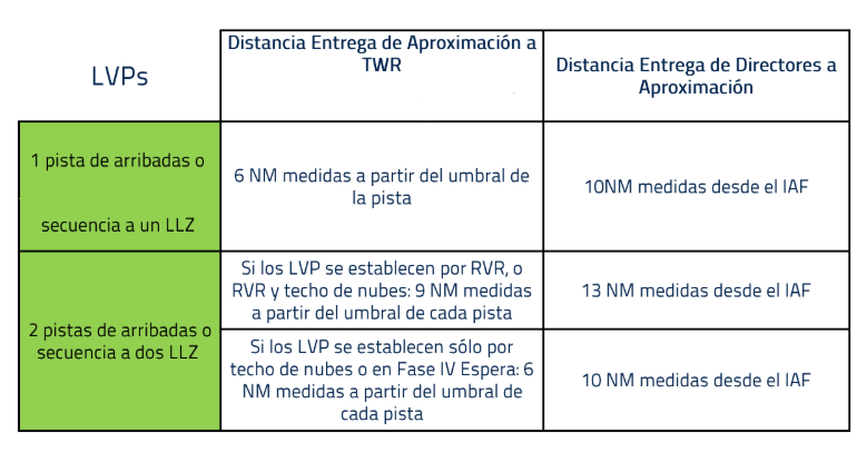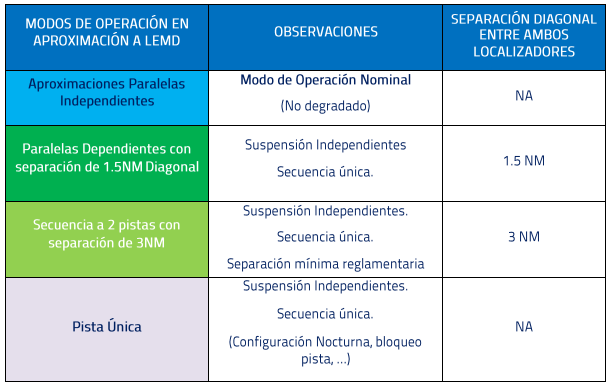 En caso de LVP en LEMD se podrá mantener el modo de operación independientes para el caso de uso de 2 pistas de arribada. En caso de operarse con 1 pista de arribadas en LEMD se establecerá el modo de Pista única (Carta de Acuerdo LECM-LEMD).