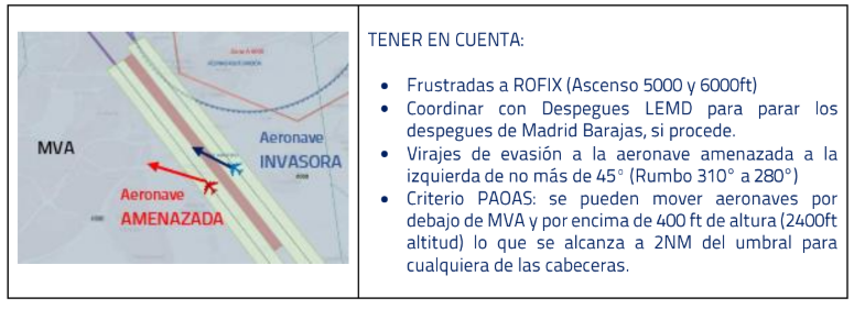 No se expedirán instrucciones de rumbo a la aeronave amenazada por debajo de una altitud de 400 ft sobre la elevación del umbral en el caso de invasión de la NTZ. Aplicando criterio de PAOAS, significa que se pueden mover aeronaves por debajo de MVA y por encima de 400 ft de altura (2400 ft altitud) lo que se alcanza a 2NM del umbral para cualquiera de las cabeceras.