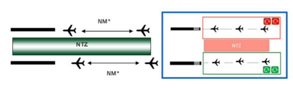 En el caso de Aproximaciones paralelas Dependientes o Secuencia a dos pistas con 3NM se mantiene el uso operativo de la NTZ y sus alertas, como apoyo (safety net) para la operación.
