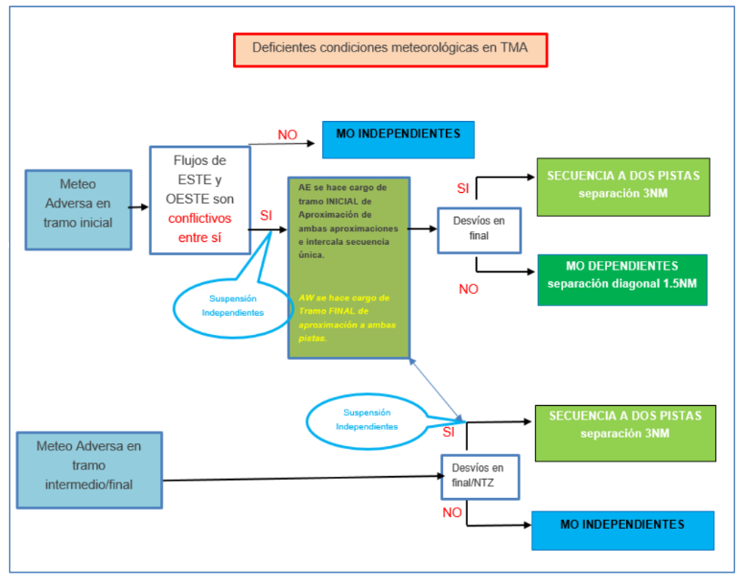 En Madrid TMA, debemos contemplar diferentes posibilidades de suspensión dependiendo de en qué tramo de la aproximación existe meteorología adversa: