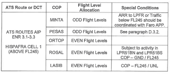 Las rutas ATS disponibles, DCTs y COPs a utilizar, así como la asignación de niveles de vuelo a aplicar, salvo que se indique lo contrario en el párrafo , se describen en las siguientes tablas.