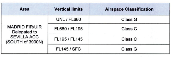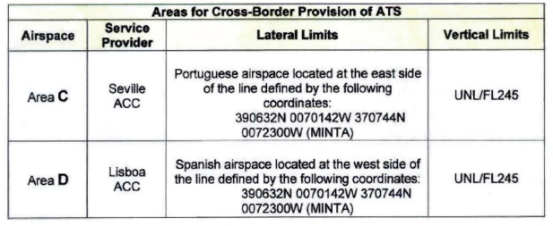 Dentro del AoR de Lisboa, la provisión de ATS de acuerdo con la clasificación del espacio aéreo es proporcionada por Sevilla ACC dentro del área siguiente: Área C (véase Apéndice 1).
