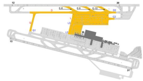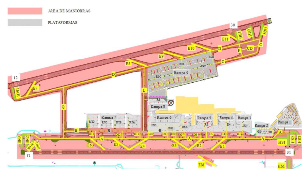 - Las aeronaves de arribada que procedan a la plataforma militar serán encaminadas por GMC hasta E3 o A1, donde mantendrán posición y se transferirán a LCL para el cruce de pista.