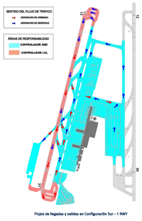 - En caso de Configuración Sur (pista 13 en uso), si se prevé que una aeronave en llegada pudiera tener algún problema en el aterrizaje que inutilizara la pista 13/31 en uso, ATC coordinará lo antes posible la apertura de la pista 12, y una vez haya sido confirmado por el Ejecutivo de servicio la operatividad de la misma, autorizará a la aeronave a aterrizar en la pista 12, siempre y cuando el piloto al mando acepte la maniobra.